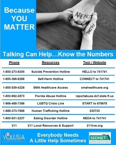 In times that feel confusing or even a little scary, it's important to remember you're not alone. Whether you're navigating personal challenges, uncertainty in the world around you, or just feeling overwhelmed, there are resources out there to help you find support, clarity, and a sense of calm. More than ever, this is a moment to lean on each other—to show up with compassion, listen deeply, and remind one another that we’re part of a community that cares and stands together through it all.
